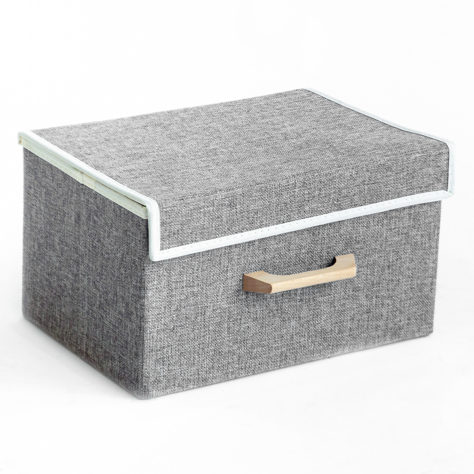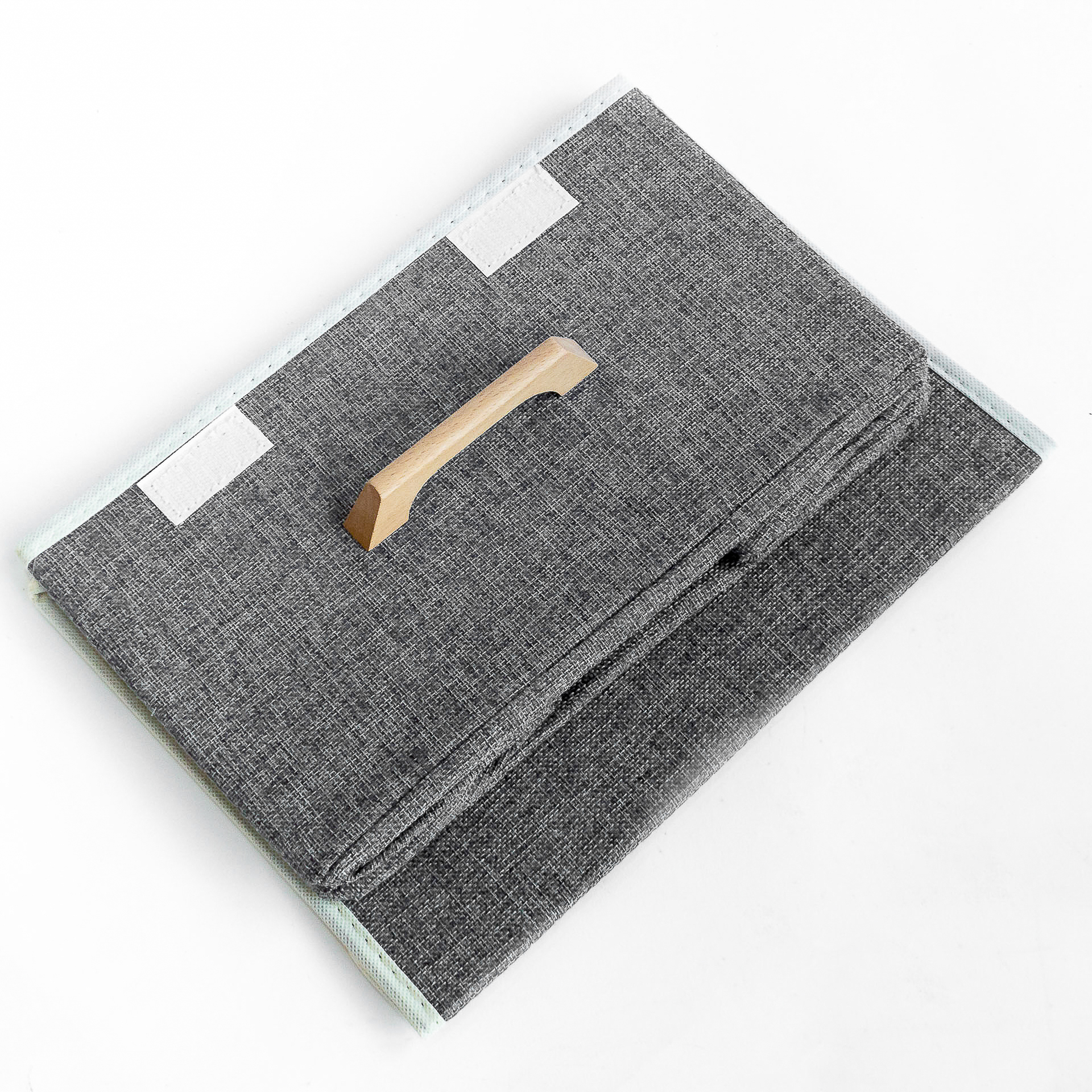 CAJA PLEGABLE FORRADA EN LINO MANIJA DE MADERA (L)