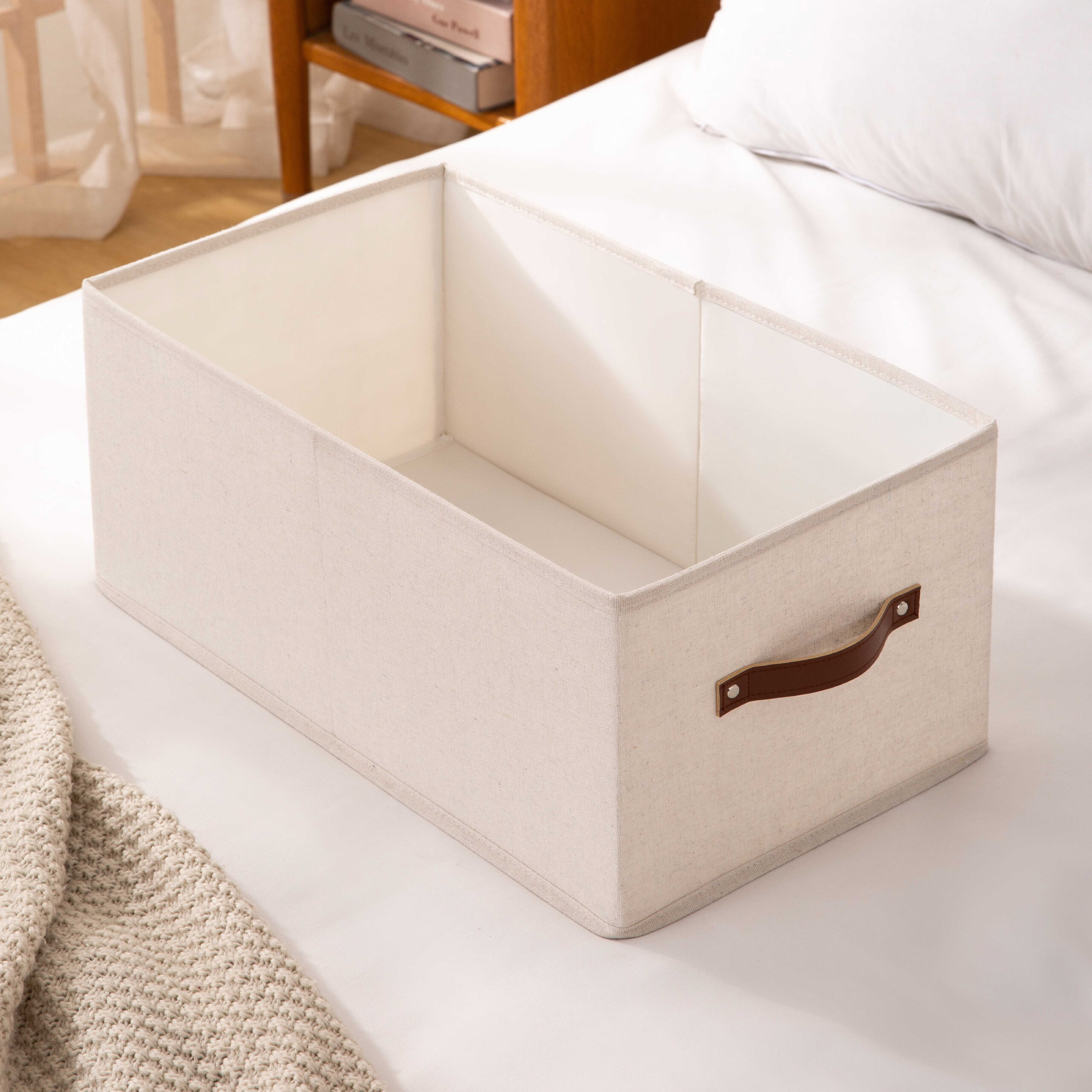 CAJA PLEGABLE FORRADA EN LINO MANIJA DE MADERA (S)